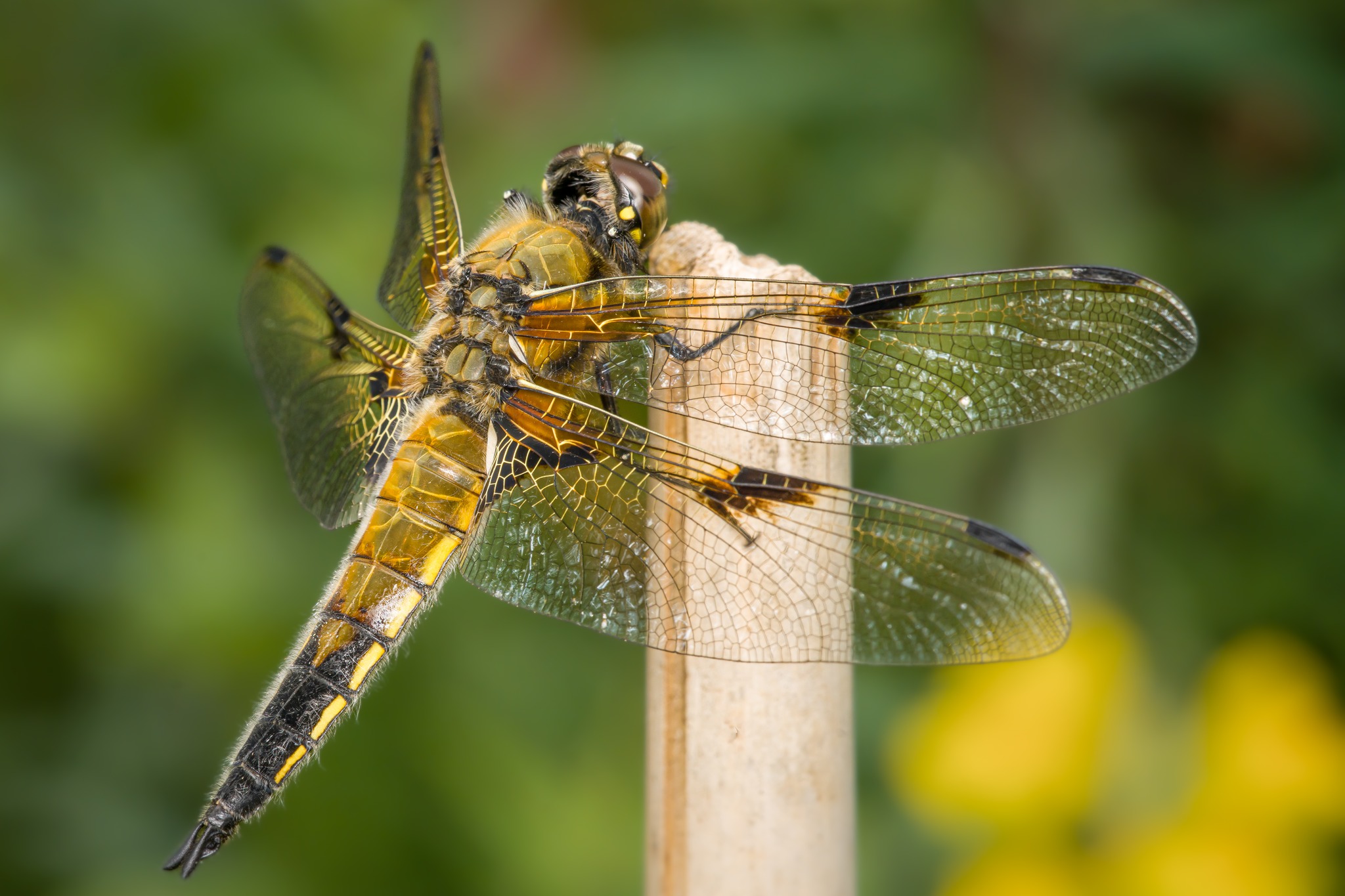 Die Pflanzen wirken wie Skulpturen aus Licht, ihre Blätter und Blüten durchzogen von Transparenz und Leben. Eine Libelle ruht für einen Moment, ihre filigranen Flügel glitzern im Gegenlicht – ein flüchtiger Augenblick, festgehalten in Ruhe und Konzentration.